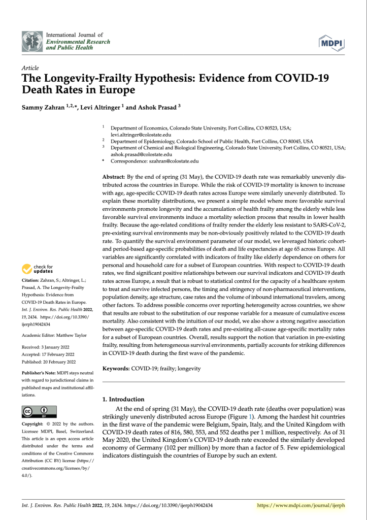 - With Sammy Zahran and Ashok Prasad. (2022). “The Longevity-Frailty Hypothesis: Evidence from COVID-19 Death Rates in Europe.” International Journal of Environmental Research and Public Health, 19(4), 2434. URL: https://doi.org/10.3390/ijerph19042434.
