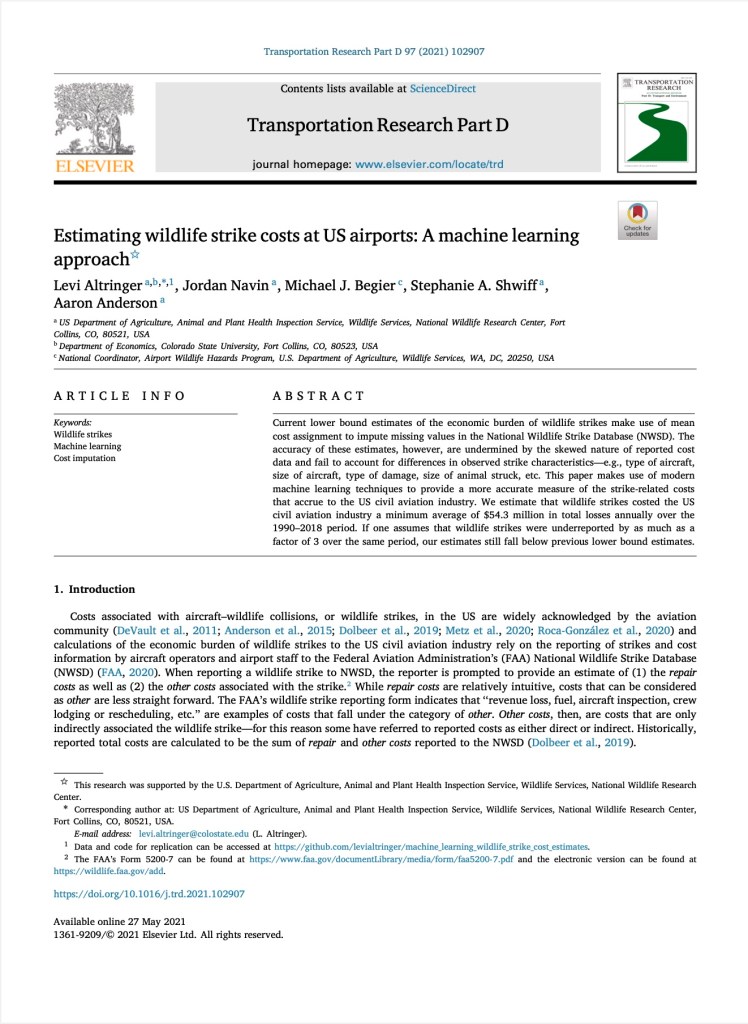 - With Jordan Navin, Stephanie A. Shwiff, Michael J. Begier, and Aaron Anderson. (2021). “Estimating Wildlife Strike Costs at US Airports: A Machine Learning Approach.” Transportation Research Part D: Transport and Environment, 97, 102907. URL: https://doi.org/10.1016/j.trd.2021.102907.