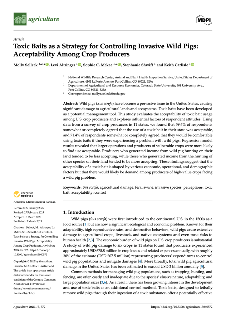 - With Molly Selleck, Sophie McKee, Stephanie A. Shwiff, and Keith Carlisle. (2025). Toxic Baits as a Strategy for Controlling Invasive Wild Pigs: Acceptability Among Crop Producers. Agriculture, 15(6), 572. URL: https://doi.org/10.3390/agriculture15060572.